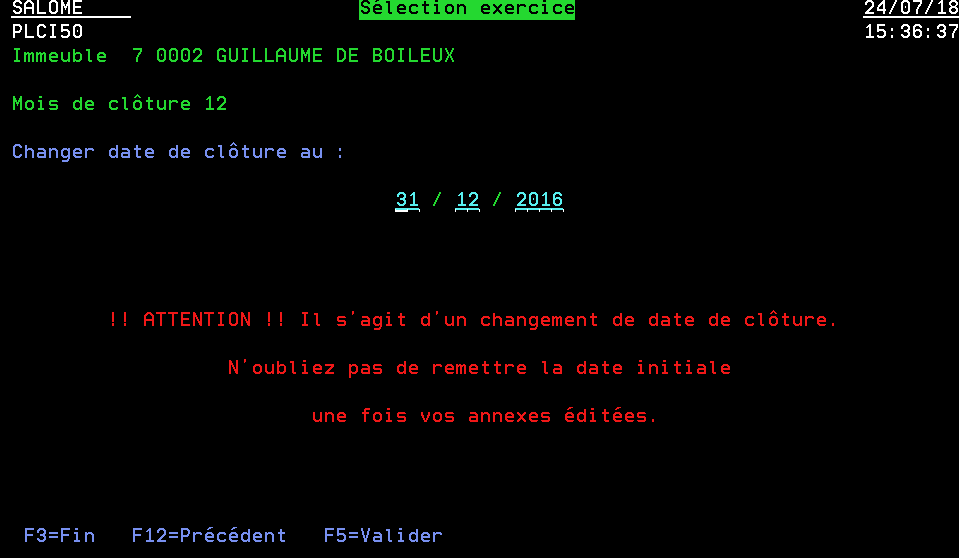 Après son accord et le paramétrage de Massistance, il faut se rendre via le menu SC010095    IMP ANNEXES ( Nouveau plan comptable ), saisir l'immeuble concerné puis option F1=Modif Date de Clôture