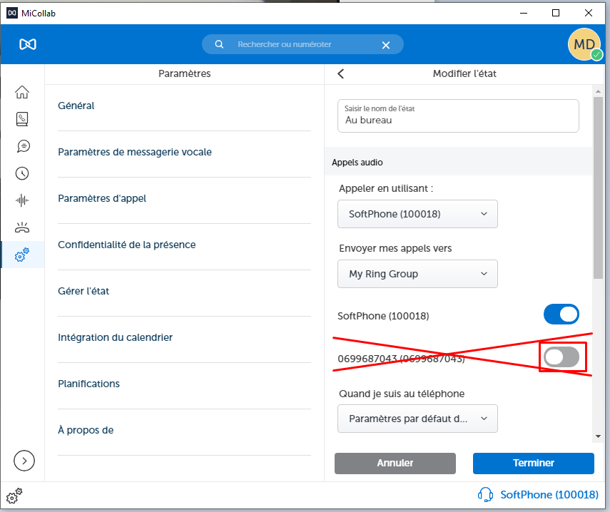 Cela permet de ne pas faire sonner le téléphone fixe et vous évite de rencontrer des problèmes si un collaborateur décrocherait vos appels. Vous ne recevriez plus vos appels sur Micollab lorsque le téléphone fixe serait utilisé.