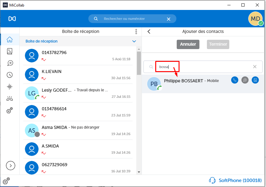 Sur cet exemple, nous voyons deux contacts disponibles sur Micollab