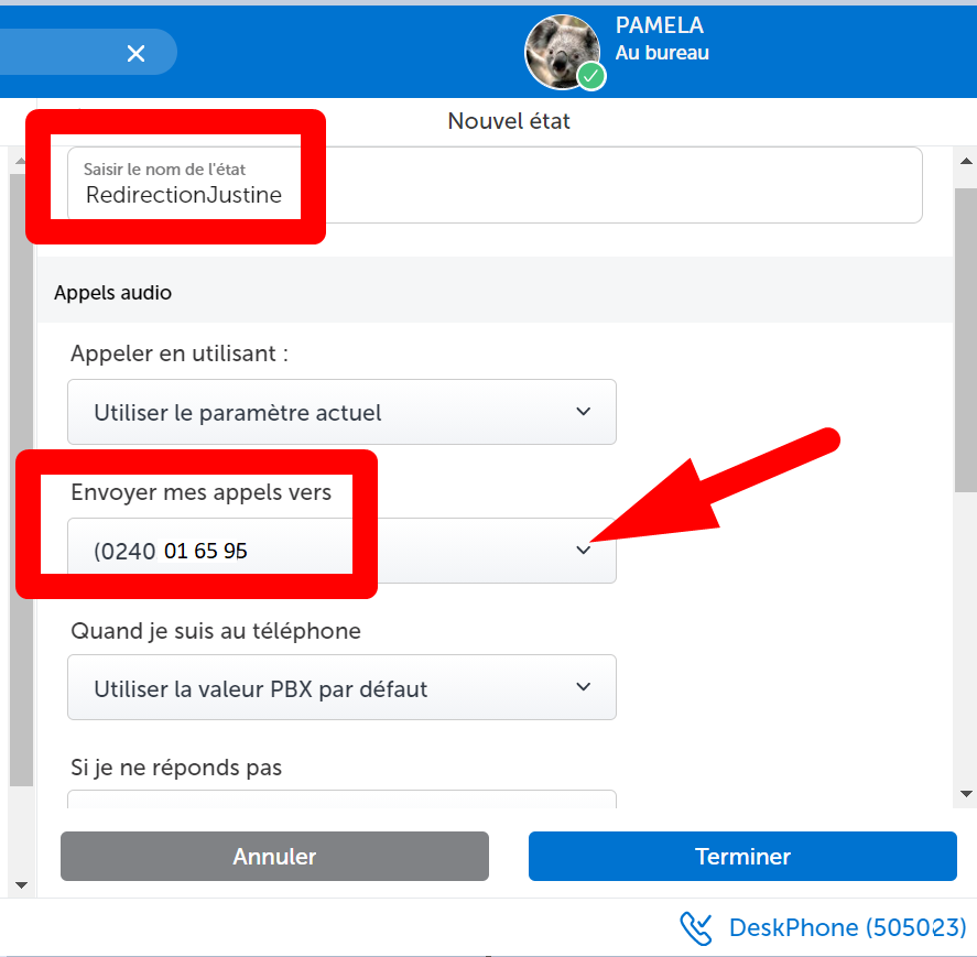 > "Envoyer mes appels vers", on sélectionne le numéro de téléphone vers lequel nous redirigons les appels lorsque l'état Micollab "RedirectionJustine" sera sélectionner.