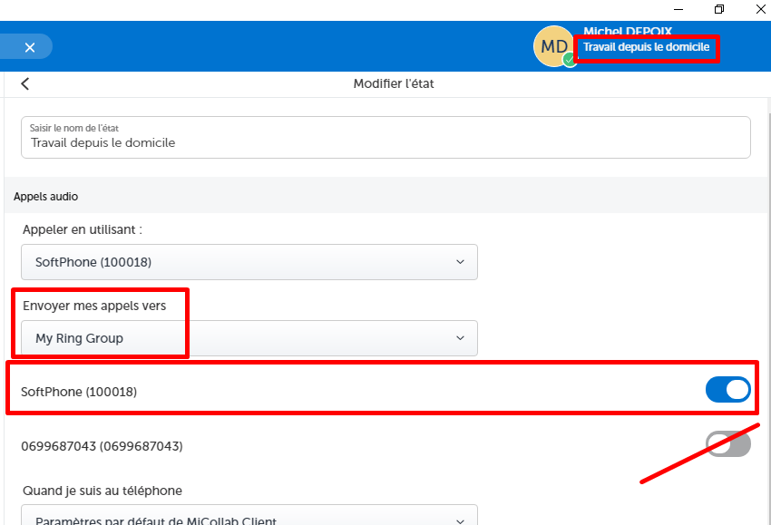 Exemple : Micollab avec l'état "Travail depuis le domicile"