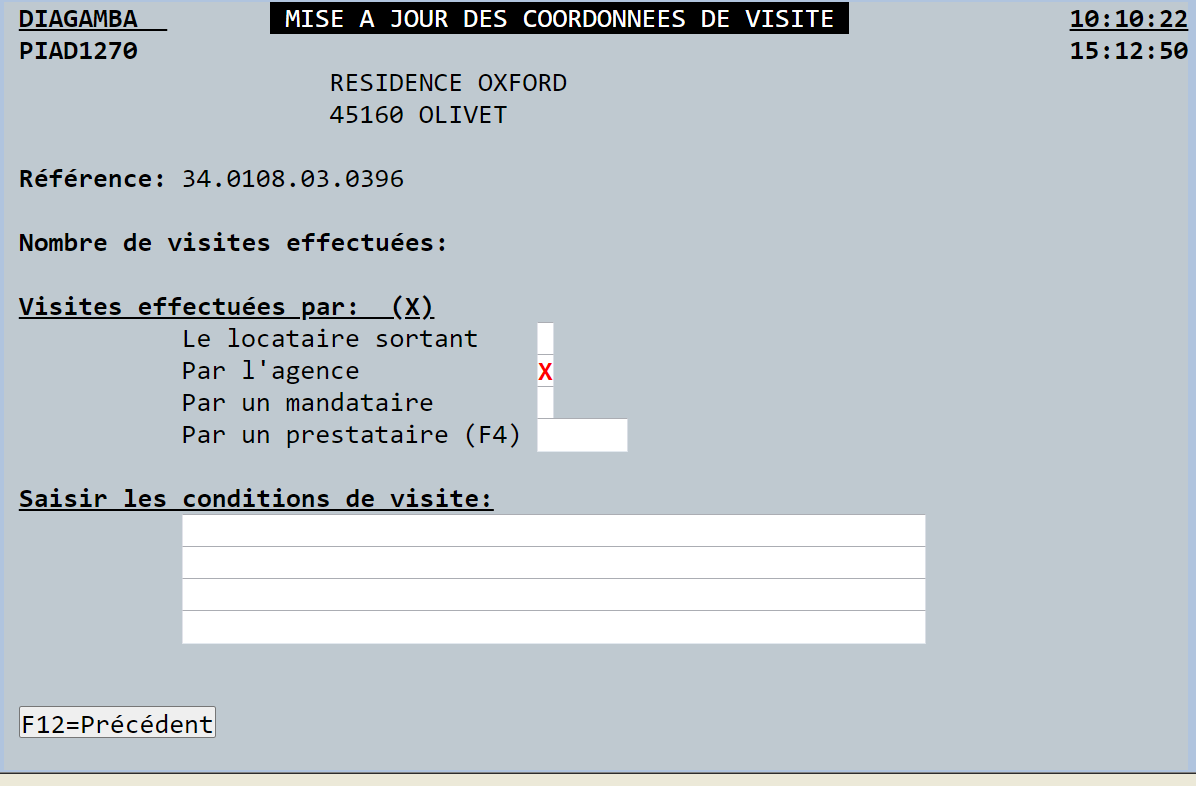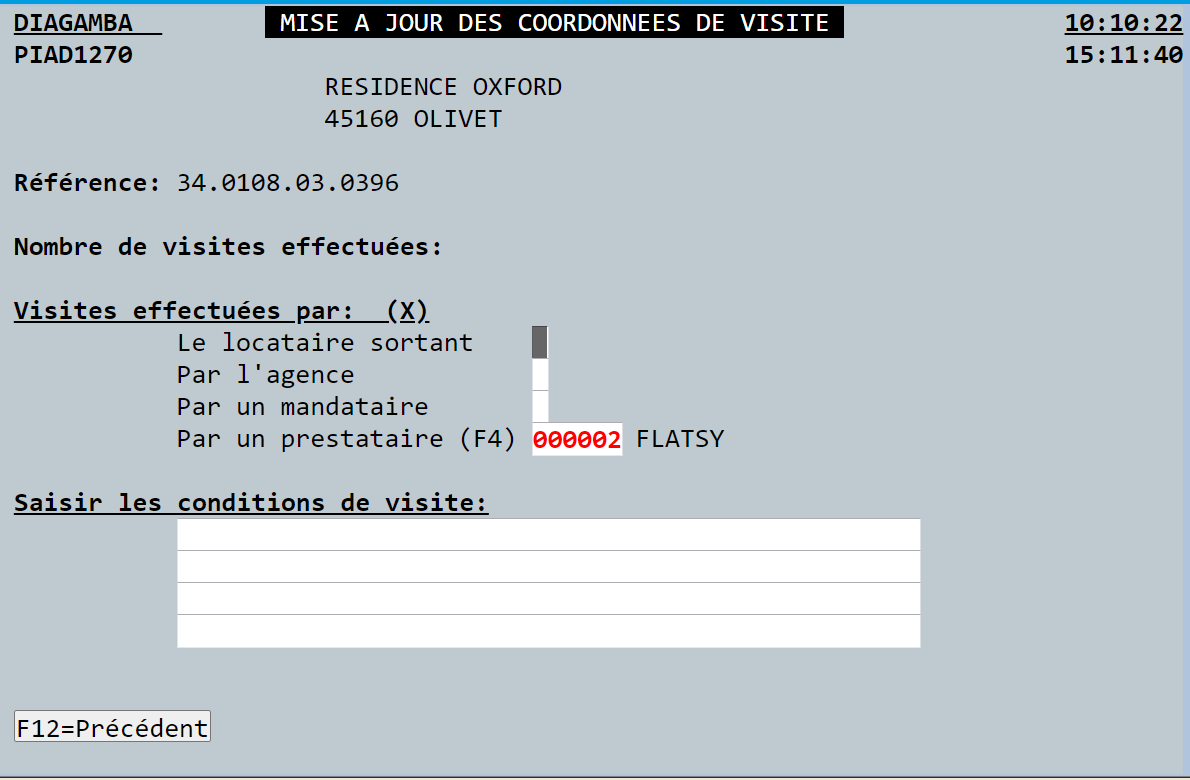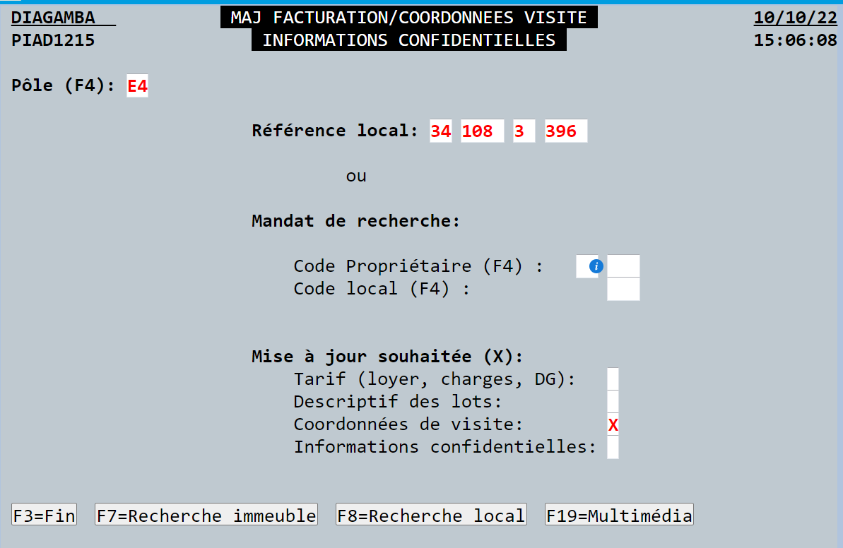 Là > saisir le pôle > puis la référence du logement > et cocher "Coordonnées de visite" dans le menu "Mise à jour souhaitée (x)" > valider avec la touche ENTREE ↓
