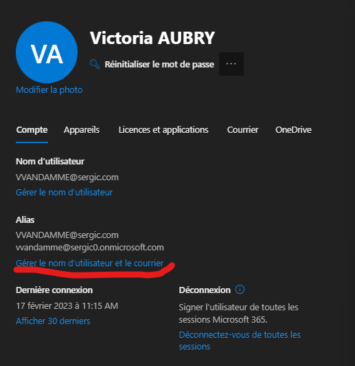 Cliquer sur l’utilisateur et cliquer sur « Gérer le nom d’utilisateur et le courrier » dans « Alias »