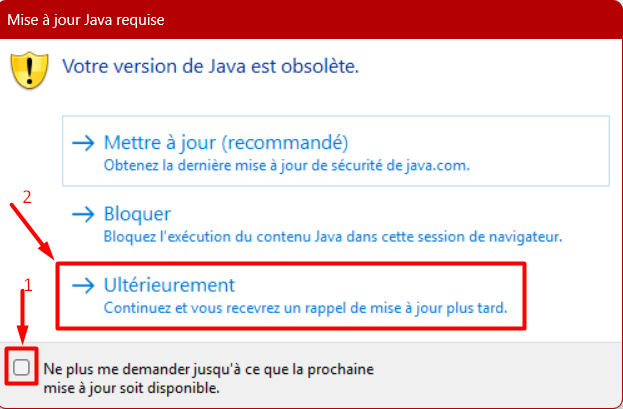 Il faudra alors cocher la case "Ne plus me demander jusqu'à ce que la prochaine mise à jour soit disponible, puis cliquer sur "Ultérieurement".