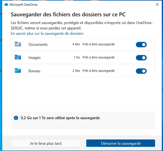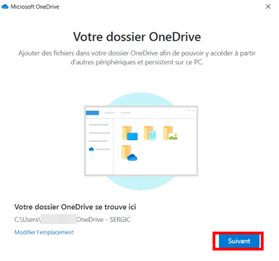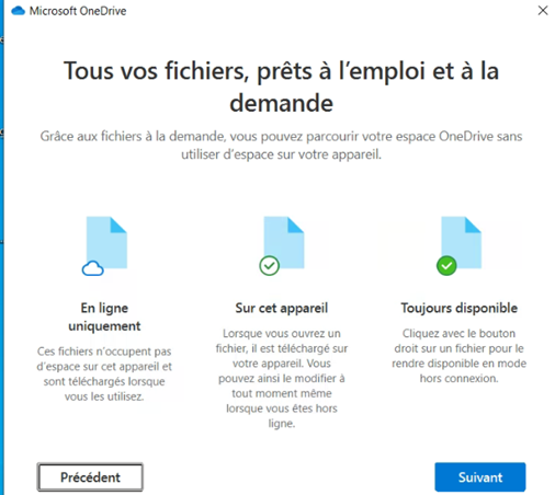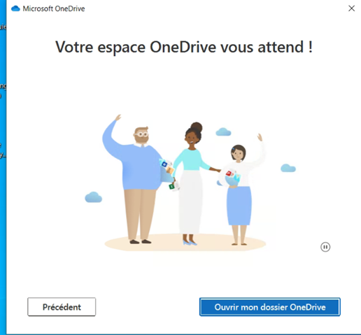 Nota Bene : Il est important de préciser qu'a partir de cet instant vos dossiers et fichiers présents dans vos répertoires Documents, Images et Bureau seront maintenant synchronisés sur votre espace Onedrive.