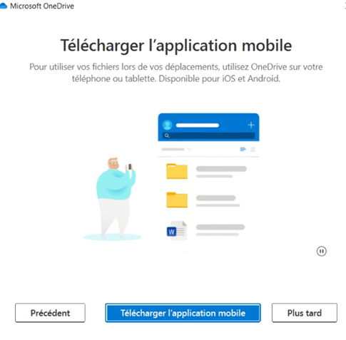 4. Pour finaliser la mise en place de votre Onedrive vous pouvez cliquer sur "Suivant" puis "Suivant" puis "Plus tard" et enfin "Ouvrir mon dossier OneDrive".
