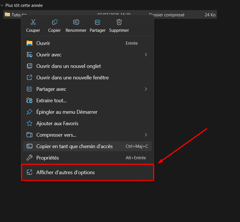 1. Faire clic droit sur votre dossier compressé (.zip) et sélectionner "Afficher d'autres options"