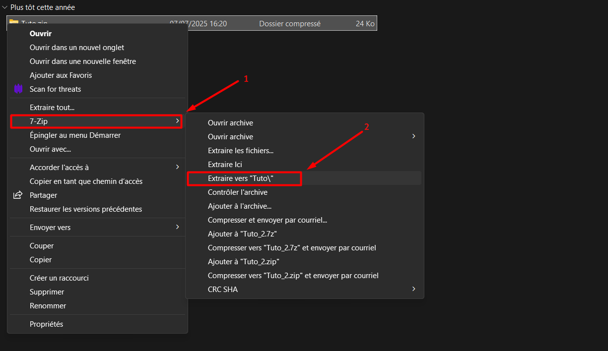 2. Survoler l'option 7-zip avec votre souris pour faire apparaitre un menu déroulant puis choisir "Extraire ici".